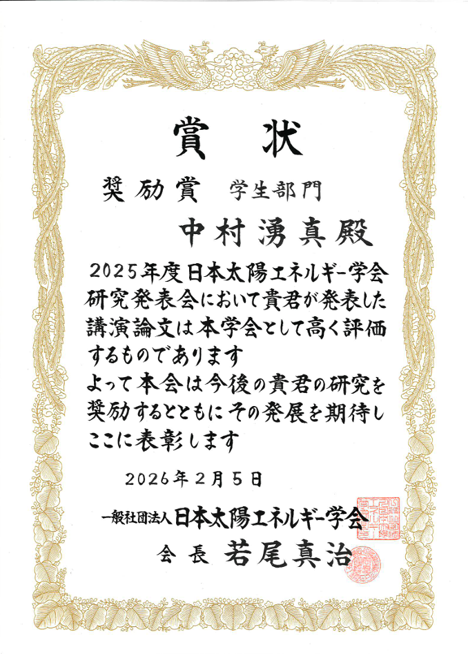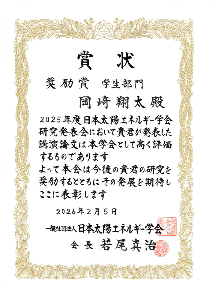 【受賞】2025年度 日本太陽エネルギー学会研究発表会にて岡﨑 翔太、中村 湧真が奨励賞(学生部門)を受賞しました。 2025年度 日本太陽エネルギー学会研究発表会にて岡﨑 翔太、中村 湧真が奨励賞(学生部門)を受賞しました。 2026.2.5